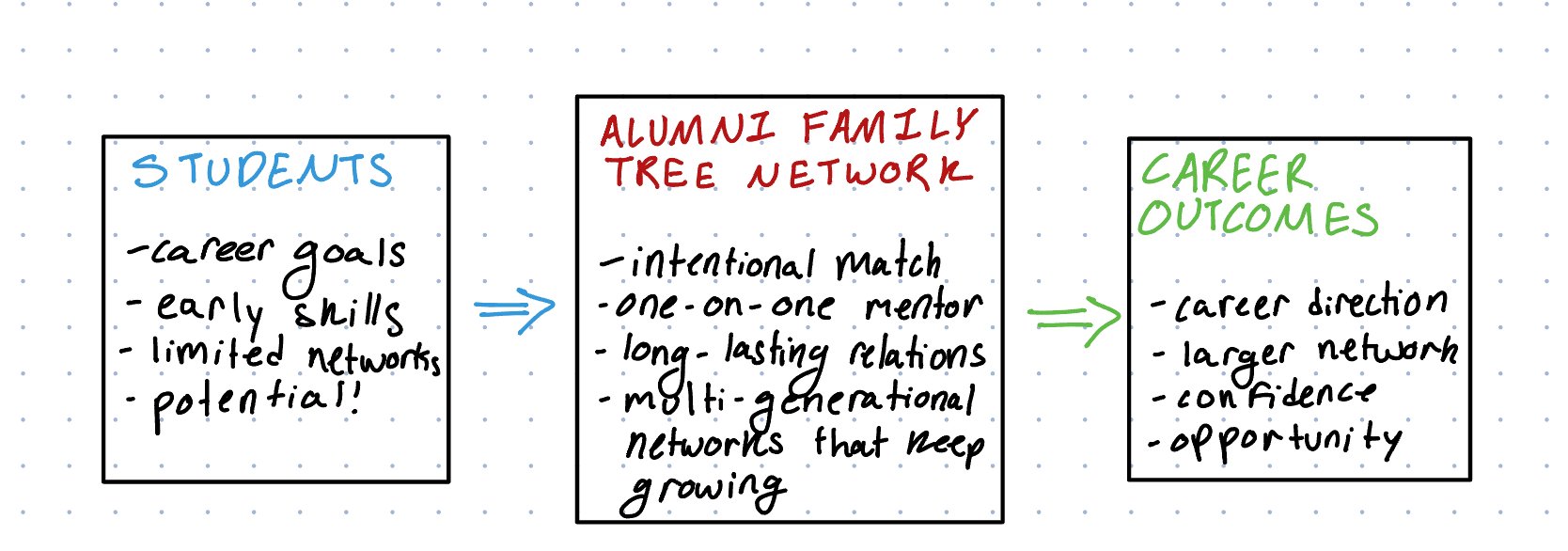 A long-term, generational networking system that pairs students with aligned alumni and grows into a multi-level “family tree.”