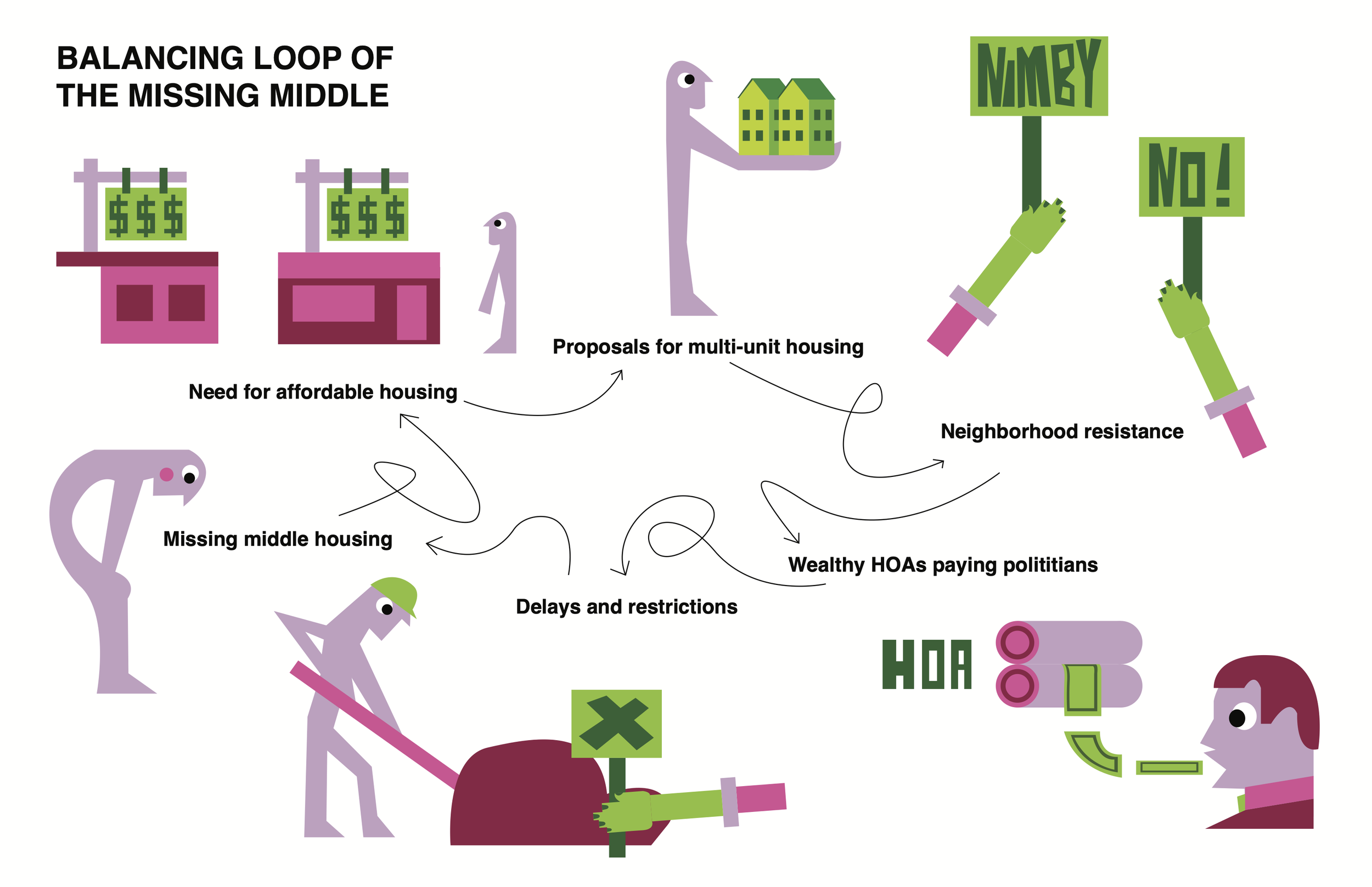 Through stakeholder interviews and systems mapping, we identified a reinforcing loop that repeatedly prevents Missing Middle housing from moving forward.