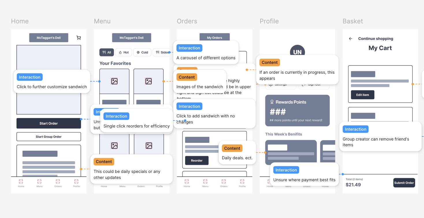 Creating wireframes made it clear that users naturally look for past orders when deciding what to get. Re-ordering felt buried, so I prioritized it by adding past orders to the bottom navigation, making it a primary and easily accessible action.